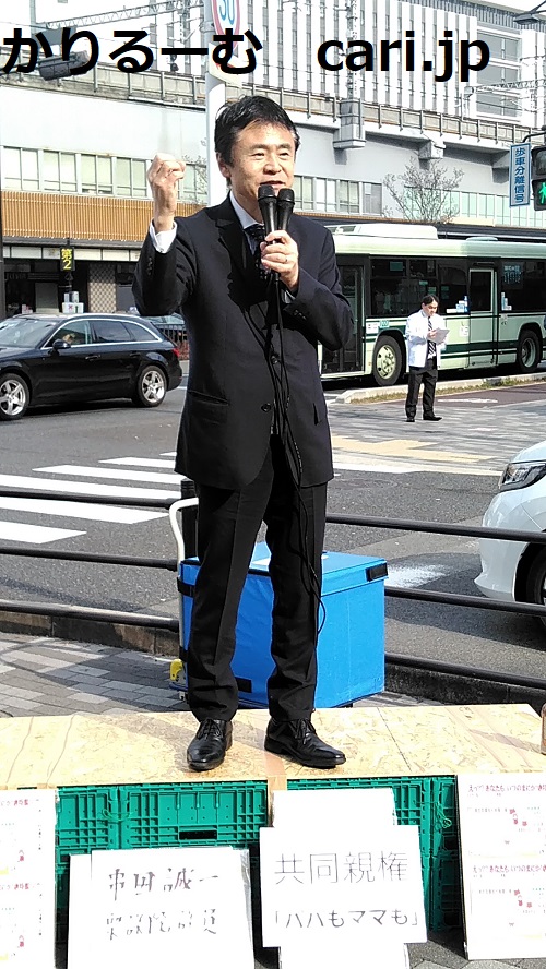 神奈川県地盤の串田誠一衆議院議員の京都駅近くでの街頭演説写真。